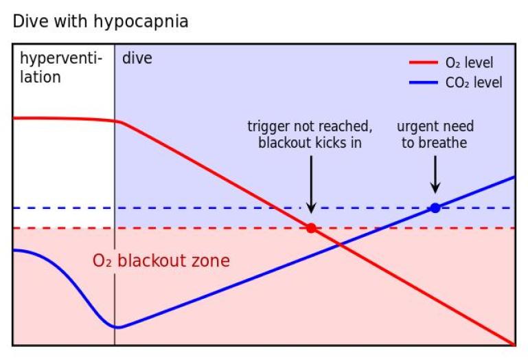 ▲专业人士潜水前若过度换气,那么在二氧化碳(蓝色)触发呼吸反射前(蓝色区间),血液中氧气(红色)浓度就会到达警戒值(红点),诱发昏迷(红色区间)。图片来源:wikiwand