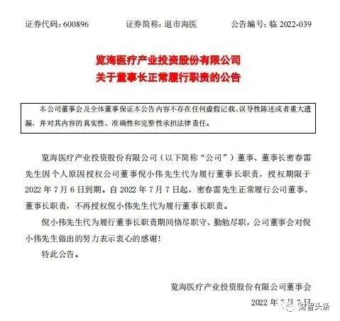 7月6日晚间,退市海医(600896.SH)发布公告称,公司董事长密春雷因个人原因授权公司董事倪小伟代为履行董事长职责,授权期限于7月6日到期。自7月7日起,密春雷正常履行公司董事、董事长职责,不再授权倪小伟代为履行董事长职责。