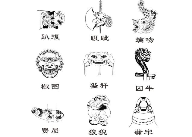 六哥叫睚眦(ya zi),他的样子像长了龙角的豺狼,性情刚烈,爱争斗。他还是我的武术老师呢,虽然常常很严厉,但是我的武功着实进步不少。