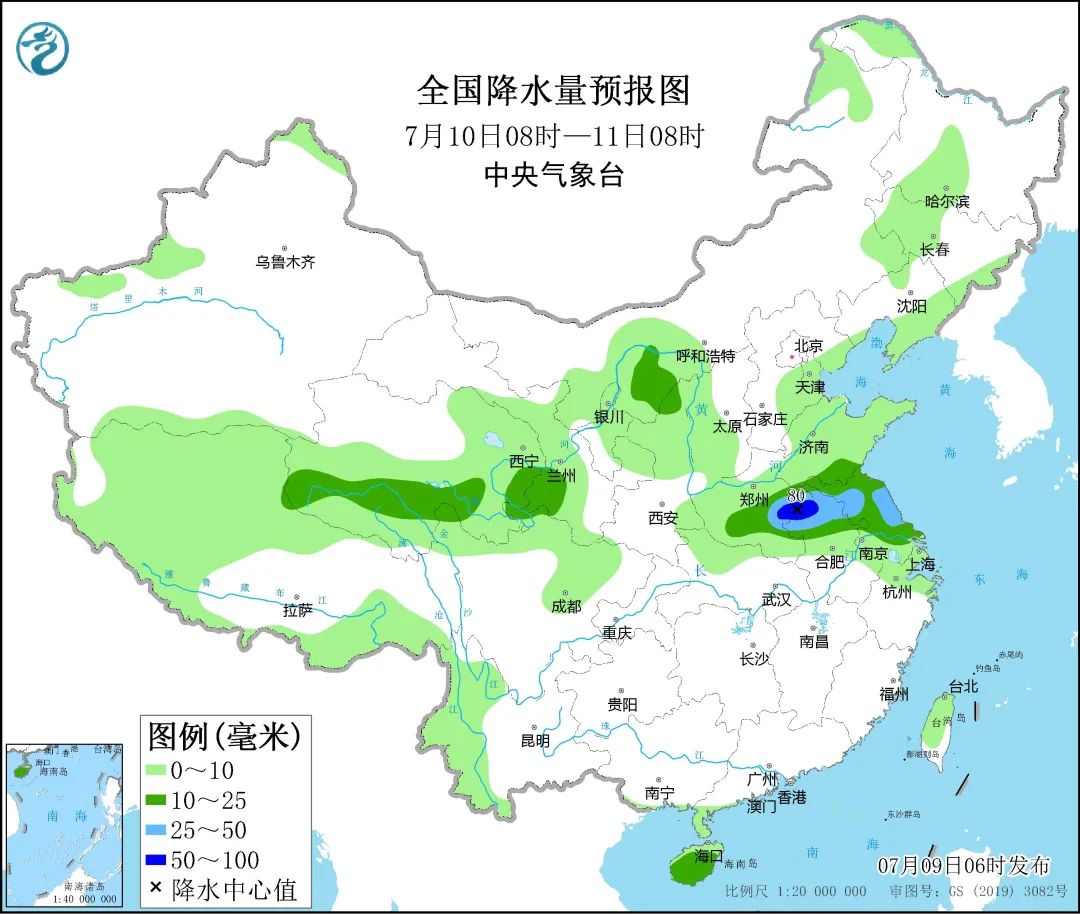 7月10日08时至11日08时,内蒙古河套地区、青海南部、甘肃南部、陕西北部、黄淮南部、江淮东部和北部、海南岛等地部分地区有中到大雨,其中,河南东部、安徽北部等地局地有暴雨(50~80毫米)。
