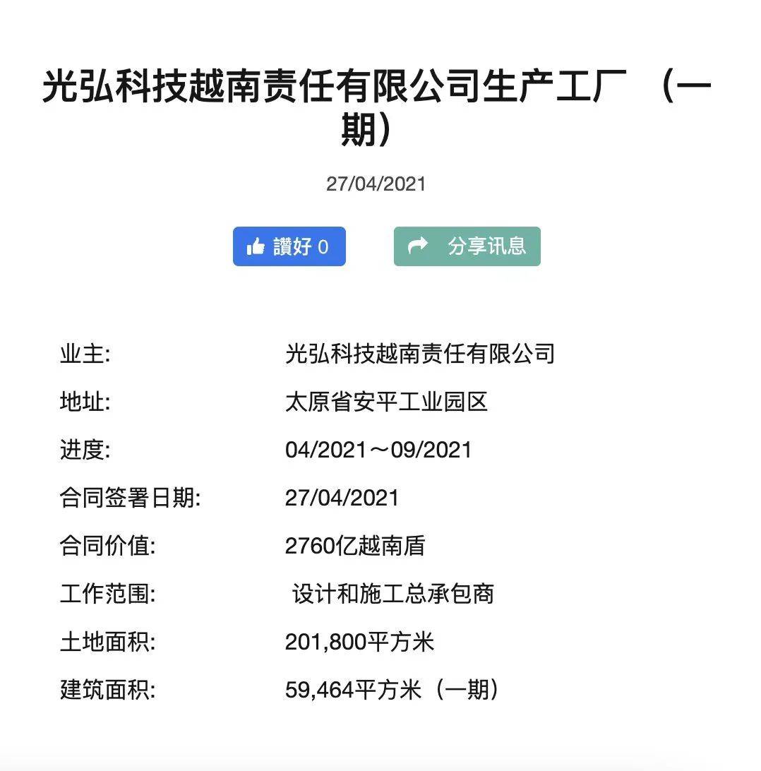 越南光弘生产基地项目由合力建设股份有限公司负责承建。合力建设股份有限公司官网披露的项目信息显示,该项目占地面积超过20万平方米,总注册投资资金为8000万美元,预计年产量约为2000万台。该工厂投产后,将为约10000名工人创造就业机会,每年为越南国家基金贡献约140万美元。而其主要产品为电话、数据传输设备、计算机、音频设备、电路板、电子元件、家用电器等等。