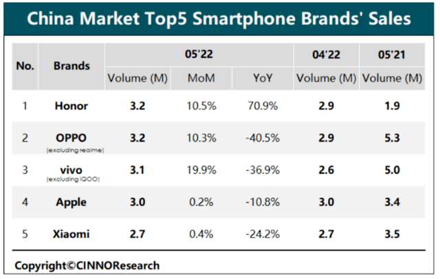 孙燕飚认为,由于疫情等原因,今年我国手机市场需求下降,这也迫使国内品牌开始积极寻找其他新市场。根据CINNO Research报告,5月中国国内市场手机销量为1912万台,较4月销量环比增加8.6%,但相较去年同期依旧下降19.7%,各厂商库存量仍然处于历史高位。