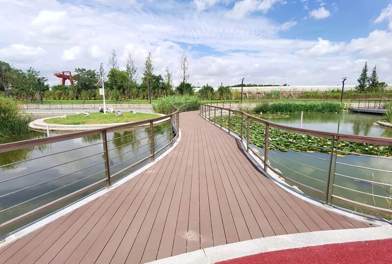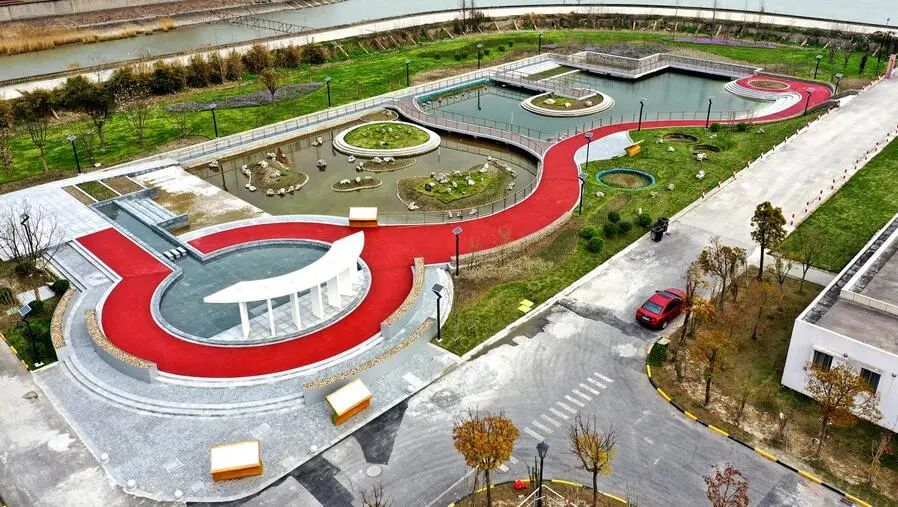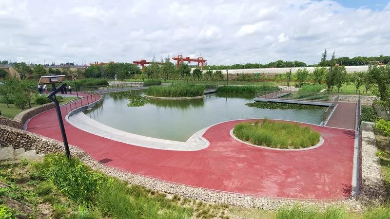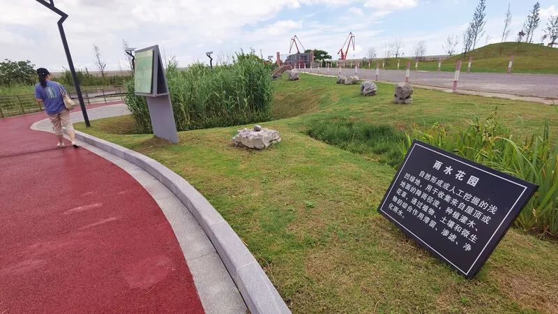 这里还新建了一座雨水花园,绿意葱茏的植被、湛蓝清澈的水面和红色动感的步行栈道相映成趣。在地上的雨水花园里,浅凹绿地和水渠会把雨水都收集起来,在植物、土壤和微生物的共同作用下,雨水被滞留、渗滤后,再排放到地下的深度处理设施,净化后才被排放至长江。让长江“喝”到的每一滴水都是净化过的。