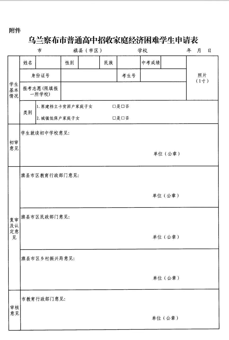 附件:乌兰察布市普通高中招收家庭经济困难学生专项计划申请表