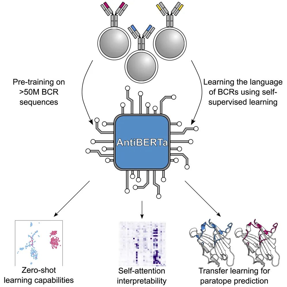 了解抗体功能对于解读疾病的生物学以及发现新的治疗性抗体至关重要。但面临的挑战是,目前可用的标记数据很有限,但抗体变体存在巨大的多样性。来自英国的抗体治疗公司 Alchemab Therapeutics的Jinwoo Leem团队在Patterns发表研究论文,为了克服上述挑战,他们使用自我监督学习来训练一个大型抗体特异语言模型,然后使用迁移学习来微调模型,以预测与抗体功能相关的信息。研究团队提供了抗体结合点预测的领先结果,从而初步证明该模型是成功的。这一模型可针对不同应用进一步微调,以提高对抗体功能的理解。