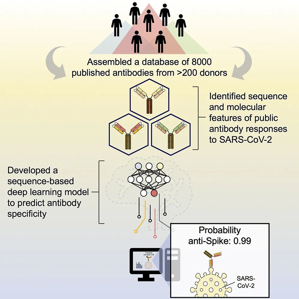 在抗击COVID-19大流行的全球研究中,已经分离并表征了数千种针对SARS-CoV-2突起蛋白的人类抗体,为研究针对单一抗原的抗体反应提供了前所未有的机会。来自伊利诺伊大学厄巴纳-香槟分校的Nicholas C. Wu团队在Immunity发表研究论文,利用从88篇研究发表和13项专利中获得的信息,收集了来自超过200名捐献者的约8000种针对SARS-CoV-2突起蛋白的人类抗体数据集。通过分析免疫球蛋白V和D基因的使用、互补决定区H3序列和体细胞高频突变,作者证明了对突起蛋白不同结构域的共同(公共)反应是完全不同的。作者进一步使用这些序列来训练深度学习模型,以准确区分针对SARS-CoV-2突起蛋白的人类抗体和针对流感血凝素蛋白的抗体。总的来说,这一研究为抗体研究提供了信息资源,增强了我们对公共抗体应答的分子理解。