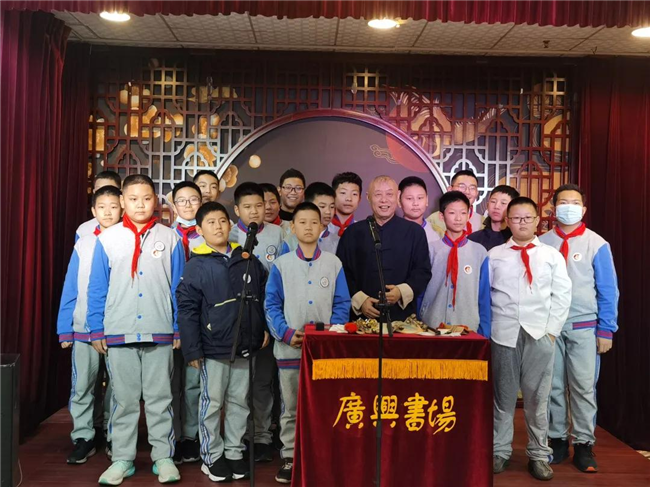 广兴书场在市中文旅局的推动下成立公益项目将曲艺带进儿童学校,山东曲艺表演艺术家们每周都会走进校园传播传统曲艺文化,现场教授孩子们使用快板,并给孩子们带去表演。