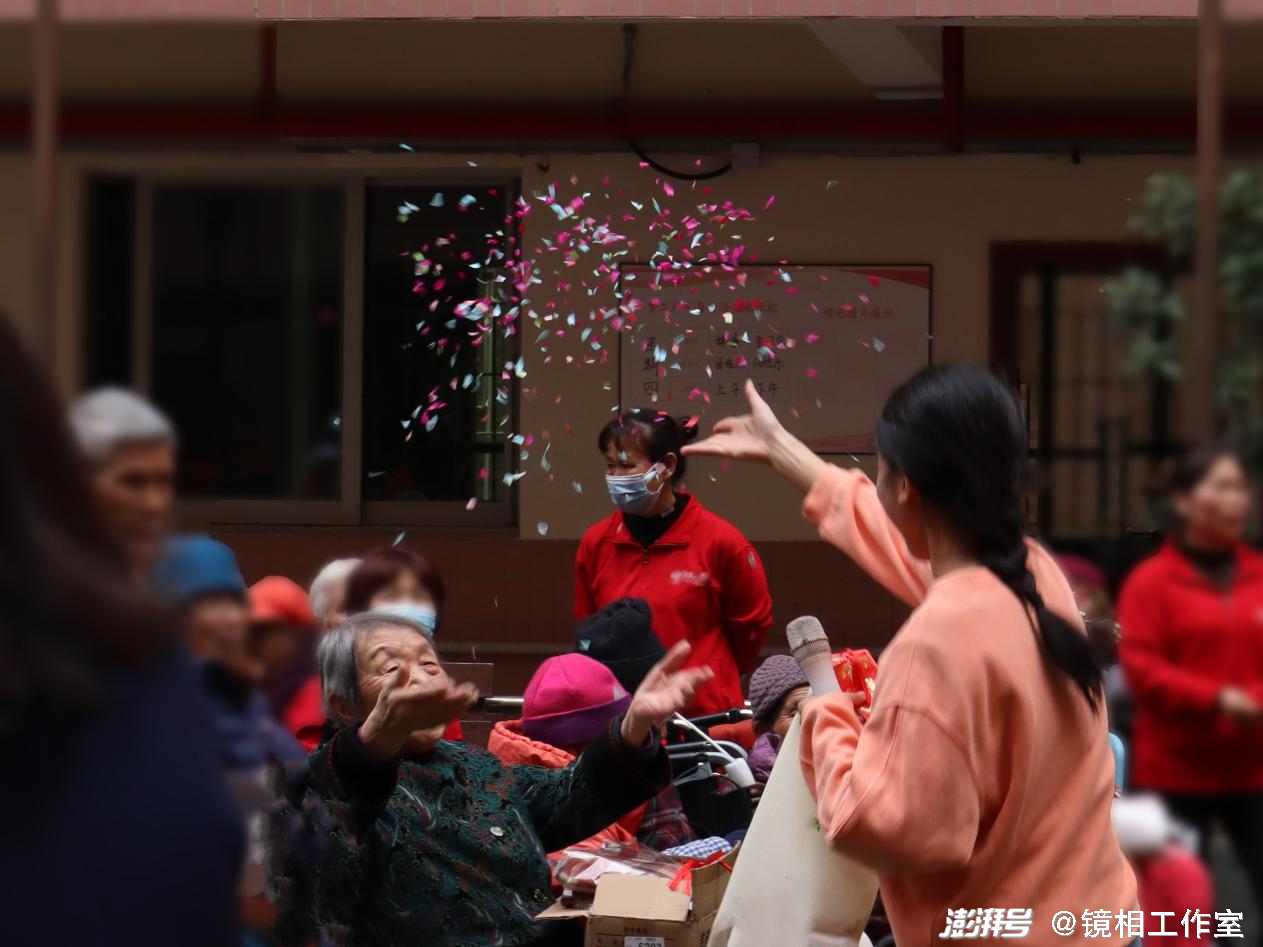 春节联欢会上,社工将彩纸洒向陶玫娟。 姜晓雪摄