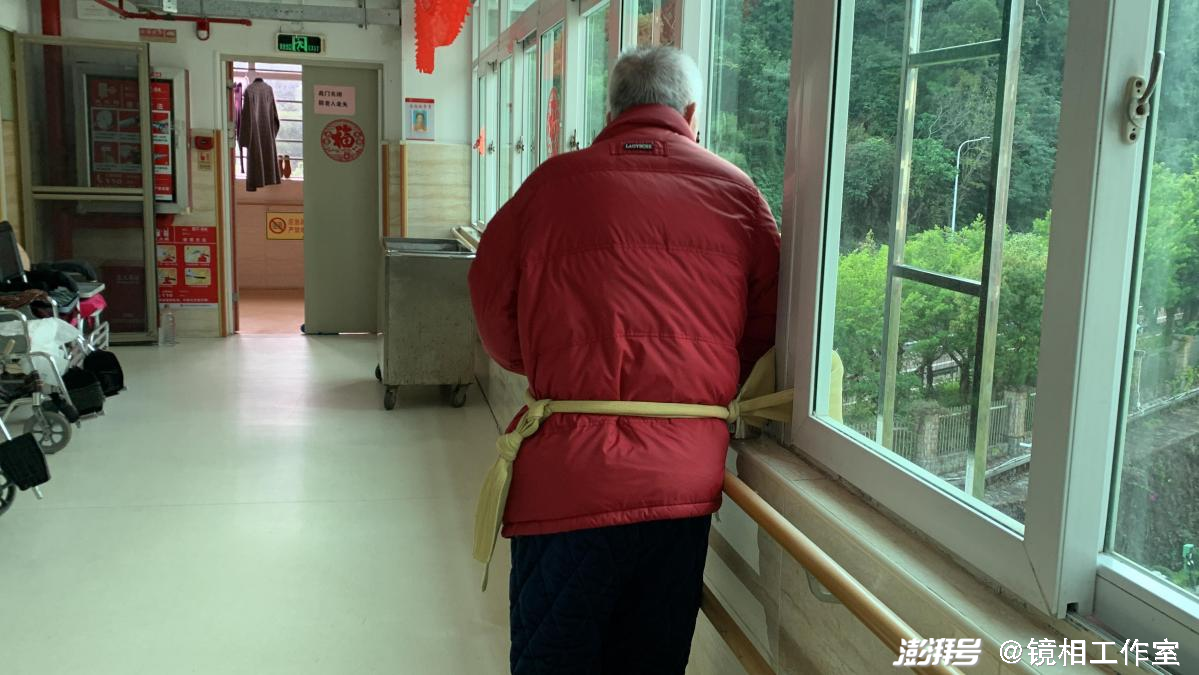 为防止失能老人站立时摔倒,护理员把他绑在走廊的窗户上。韩倩倩摄