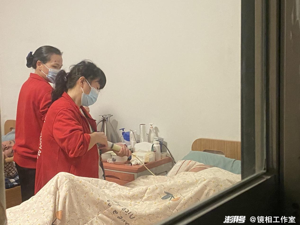 两位夜班护理员给老人打流食。 林嘉敏摄