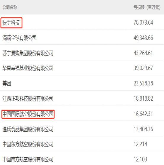 以各家公司财报显示的亏损数字为统计依据,居亏损榜首位的是快手,亏损额超过780亿元;滴滴亏损493亿元,位列亏损榜第二位;苏宁易购亏损432亿元,位列亏损榜第三位。陷入债务困境的华夏幸福基业股份有限公司位列亏损榜第四位。而中国国航、南方航空、东方航空全部进入榜单前十。