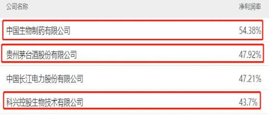 另一盈利能力指标净利润率方面,排位最高的是中国生物制药,净利润率高达54%。位居净利润率榜第二位的是贵州茅台酒股份有限公司,净利润率约为48%。