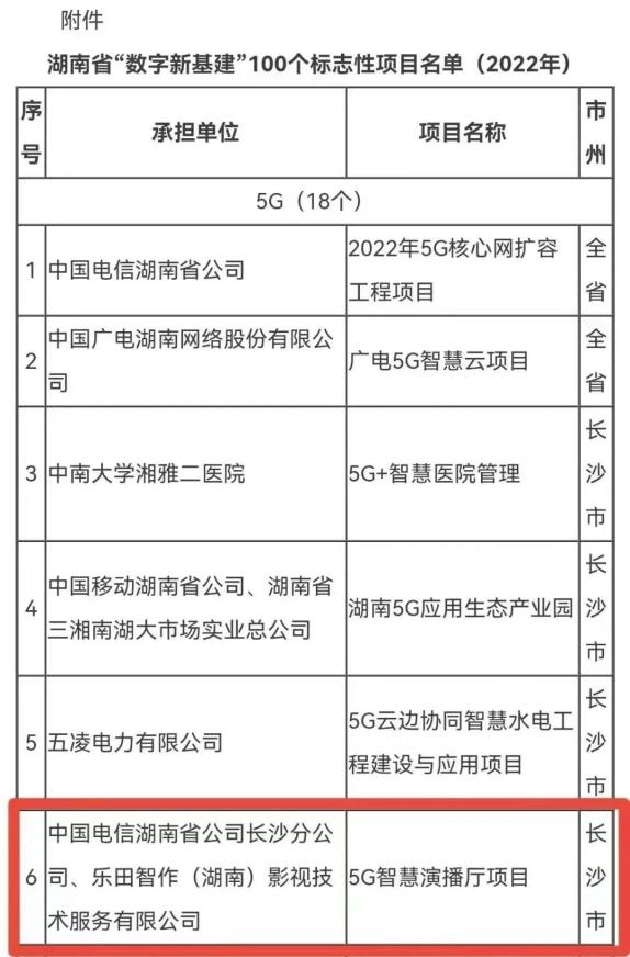 马栏山视频文创基地也将成为业内具有标志性的视频文创基地,其体量、专业度、标准化,以及与 5G 云技术融合实践,在业内具有独具一帜的创新型和示范性。2022年5月23日,乐田智作与长沙电信共建的5G智慧演播厅被评为《湖南省“数字新基建”100个标志性项目名单(2022年)》,为马栏山智造继续奔跑。