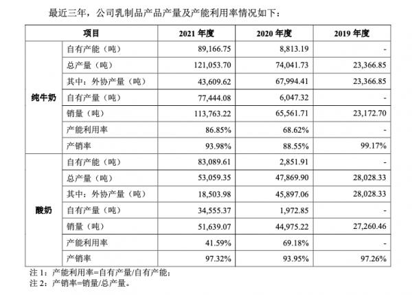 但是,这样测算下来,奶源的产量与成品的产量无法匹配起来。招股书显示,2021年公司的纯牛奶产量加上酸奶产量共有17.42万吨。