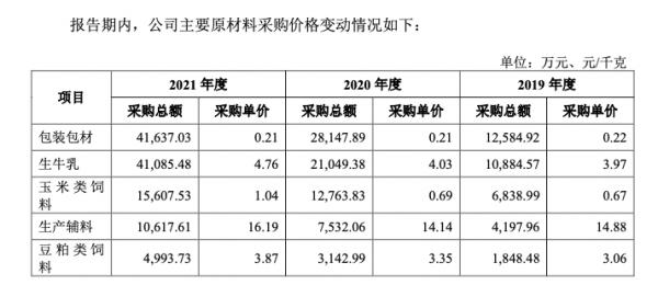 招股书明确显示,公司需要向外采购生牛乳。2021年生牛乳的采购总额为4.11亿元,单价4.76元/千克,据此测算,2021年,公司向外采购的生牛乳有8.63万吨。