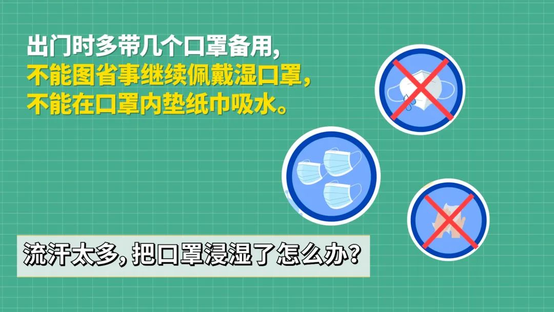 在人员密集的场所、空间狭小场所,或近距离接触其他人时可使用医用外科口罩或防颗粒物口罩(KN95、 N95等)。一次性使用医用口罩和医用外科口罩均为限次使用,累计使用不超过8小时;职业暴露人员,使用口罩不超过4小时,不可重复使用。流汗太多,把口罩浸湿了怎么办?