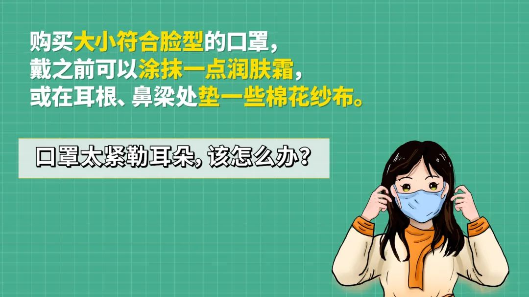 购买大小符合脸型的口罩,需要长时间佩戴口罩的人,建议在鼻梁、颧骨、耳根等部位,涂抹润肤剂,既能减少口罩和皮肤之间的摩擦,又能保护皮肤润滑。长期戴口罩出现皮肤问题