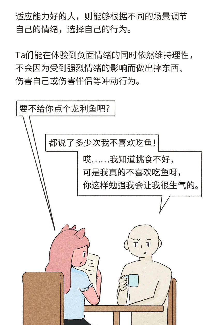 b. 有适应能力,指的是有能力根据场景的变化调节自己的情绪,控制自己在情绪状态中的行为反应。