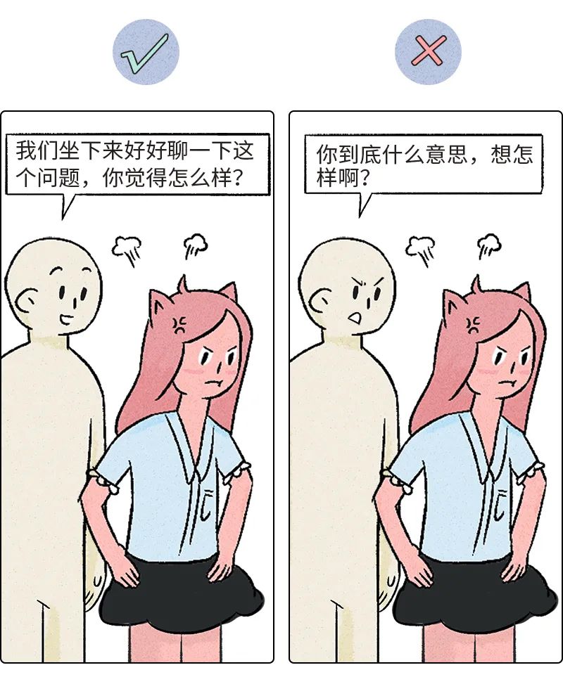 通过清晰而温和的讨论,对方可以感知到你对ta的尊重和关心。避免用责备、攻击的语气,因为这可能会令ta感到更加愤怒,相当于在增加对方的情绪成本。