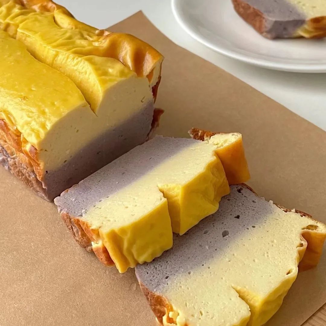 3.铺了烘焙纸的模具中依次倒入紫薯味抹匀,再倒入原味抹匀。