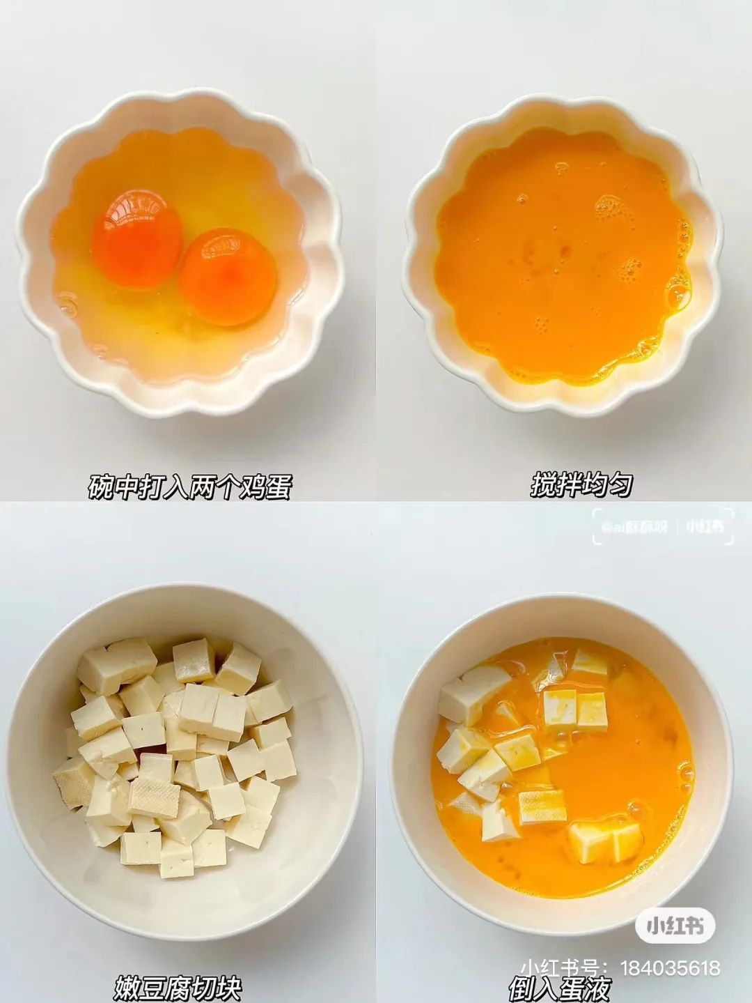 1.鸡蛋打散倒入嫩豆腐块一起备用。