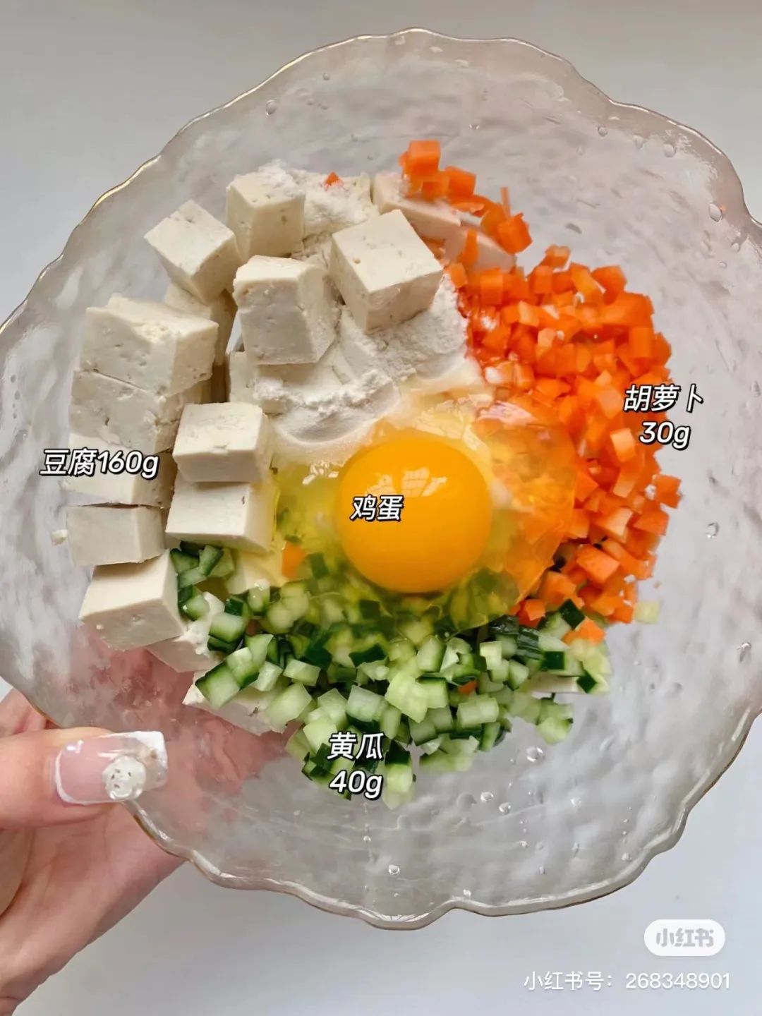 1.把豆腐切块碾碎、加黄瓜丁、胡萝卜丁、鸡蛋、一勺玉米面或者全麦面粉搅拌均匀。
