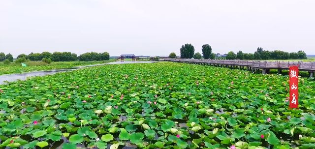 微山岛被誉为“红色渔乡 度假绿岛”,是中国北方最大的内陆岛。盛夏时节,岛上万亩荷花齐齐盛放,点点红色如火、似霞,与朝阳霞光交相辉映,闪烁在波光粼粼中。