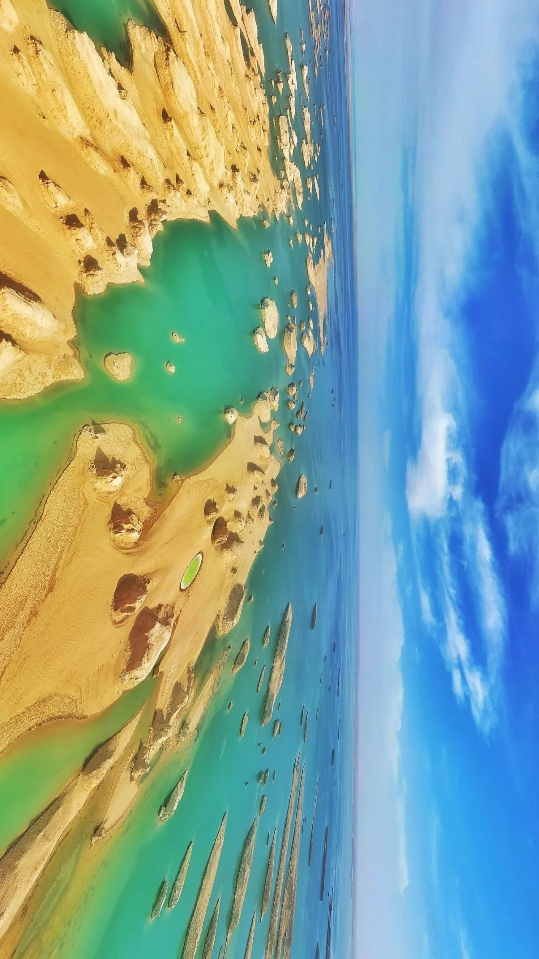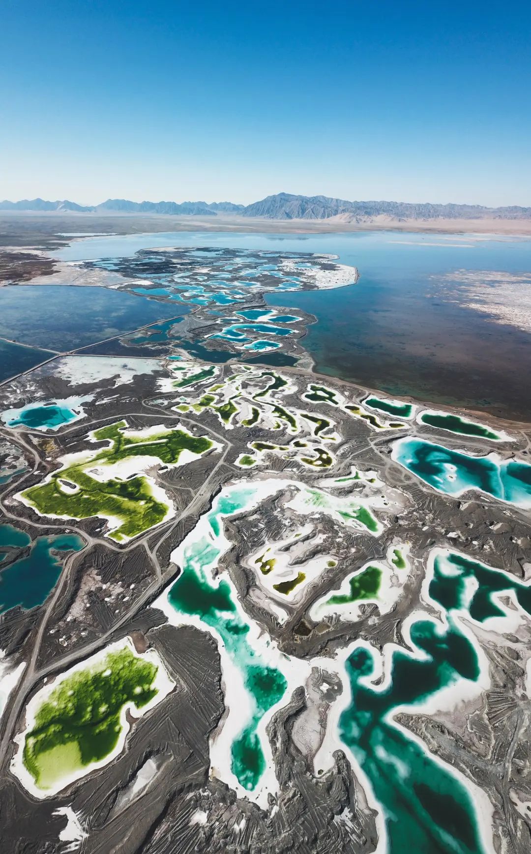 从天空俯瞰,在柴达木盆地东北边缘的大柴旦镇,一片弓字形区域,大小不等、形态迥异、深浅不一的盐池星罗棋布,宛如一个个精致的翡翠点缀在盆地戈壁间,美丽而神奇。