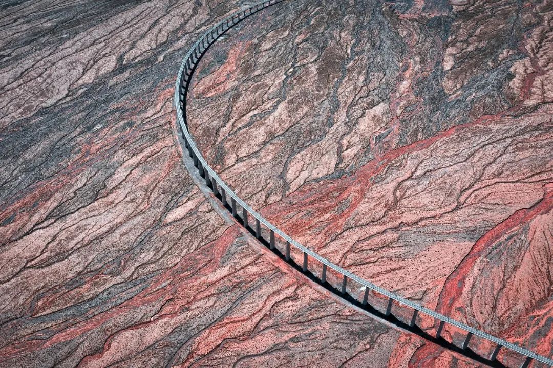 图为酒泉市肃北县冲积扇上的敦格铁路