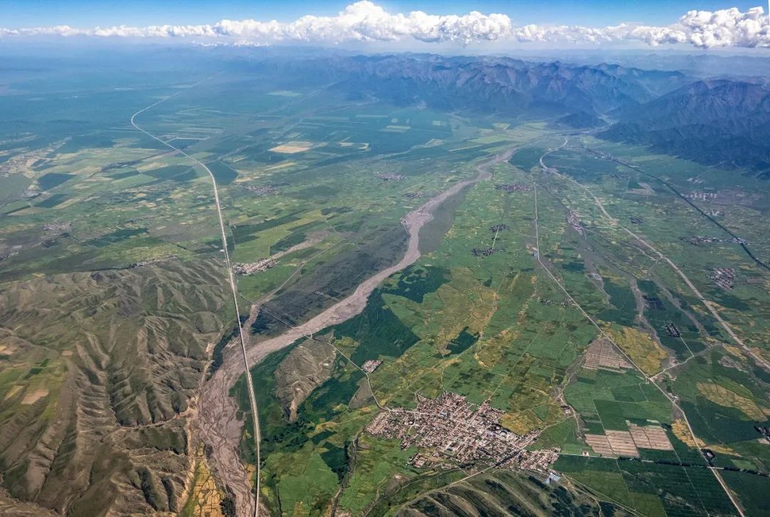 高大的祁连山截住了东南季风的水汽后,让山区变得郁郁葱葱海拔更高的地方雪山连绵不息。