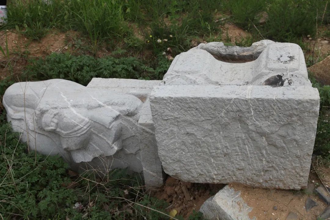 从第三座山的西北方向下山,我们奔向位于第四峰的清风寺遗址,寻找清代石罗汉的残像。遗址如今是一片杂草丛生的坟茔。我们撩拨开一丛丛茂盛的杂草,在一座座墓碑旁辗转,翻越,在一座坟茔的东北方向,终于发现了6座罗汉残像。这6座残像均无头部,头部以下从身体到脚踝,基本完好。残像下部的土地里,显出两座石像的白色底座。6座残像分布三处,一处一座的,平置;一处两座的,一平置,一侧置,形成一个上粗下细的“T”形;一处三座,两座同向平置,一座逆向平置,构成一个象形的“人”字。
