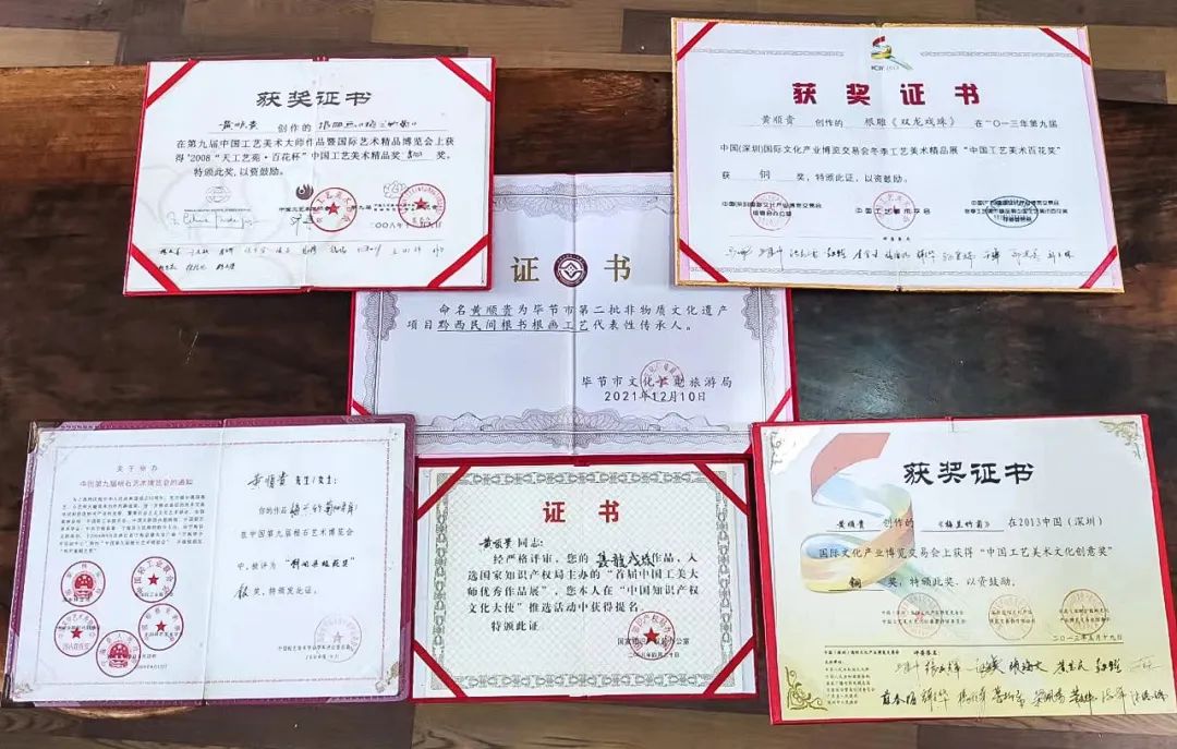 今年69岁的黄顺贵,是毕节市第三批市级非遗名录中黔西民间根书根画工艺项目代表性传承人。