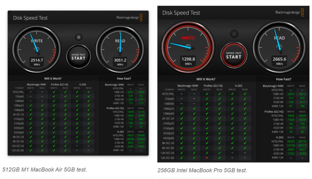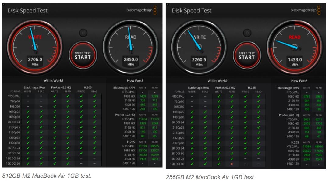 根据在 Blackmagic 的 Disk Speed Test 程序中观察到的结果,M2 MacBook Air 的基本型号硬盘写入速度通常比 512GB 型号慢 15% 到 30%,读取速度则会慢 40% 到 50%。