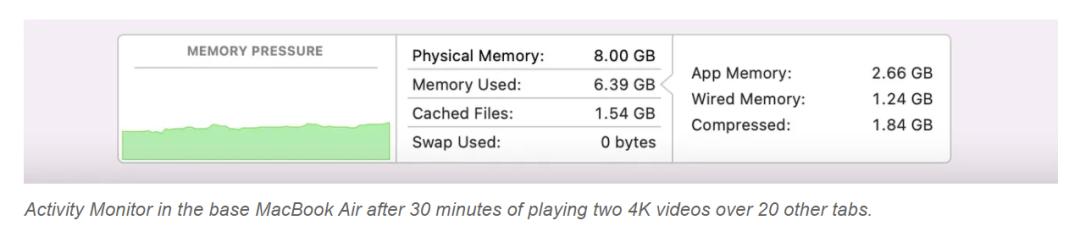 那么,这些差异会对消费者产生影响吗?如果只谈日常使用,Air 的潜在消费者可能感受不到 256 GB 和 512 GB 之间存在巨大差异。测试者在两台机器上用 25 个打开的 Chrome 标签页播放了两个 4K YouTube 视频 30 分钟,二者都没有用到虚拟内存,启动时间也几乎一样。她把两个设备并排放置了很多次。在打开日常使用的应用程序(包括 Chrome、Safari、Messages、Photos、Activity Monitor、Slack、Music 等)时,她没有看到太大的区别。