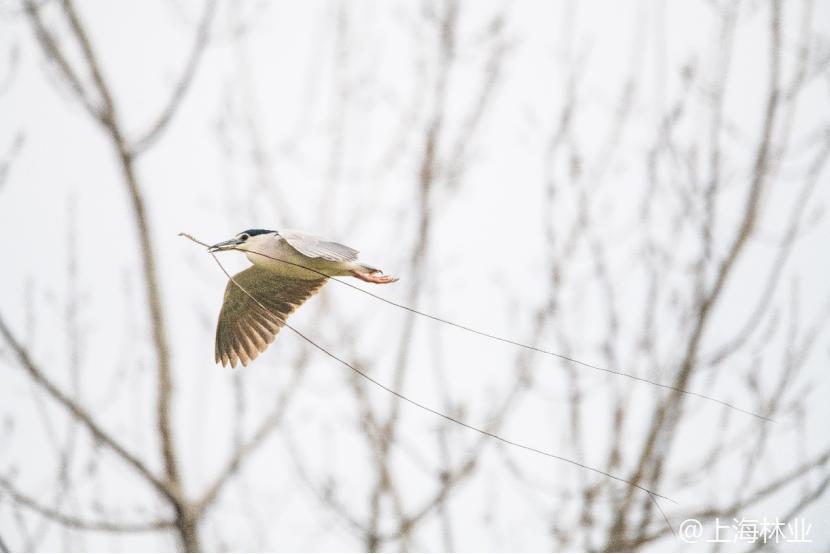 夜鹭嘴里携带着长长的树枝作为筑巢的材料(摄影:@郑运祥)