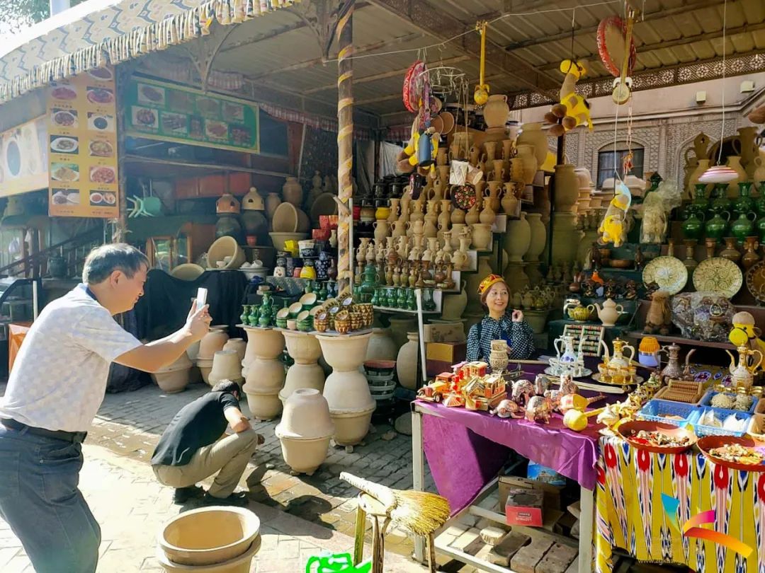 游客在喀什古城景区内花盆巴扎拍照打卡。喀什全媒体记者 汪玉珍 摄