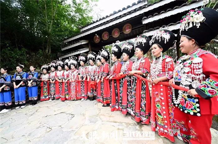 7月4日,农历六月初六,在盘信镇的苗寨大湾村,苗族同胞身着节日盛装齐聚一堂,他们唱苗歌、打花鼓、吃长桌宴,载歌载舞欢庆传统节日“六月六”情人节。