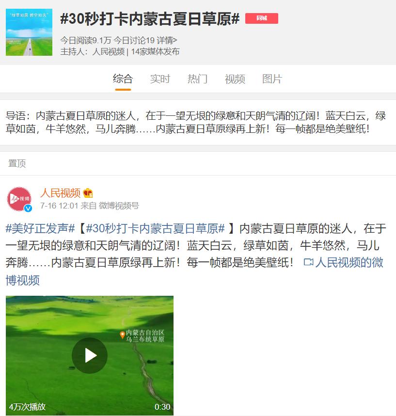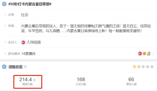近日 人民视频发布话题#30秒打卡内蒙古夏日草原#,阅读次数达到209万。