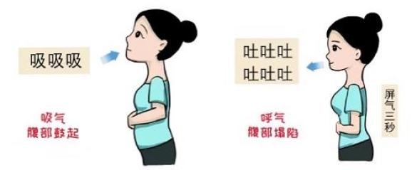 用鼻子缓慢吸气,嘴巴嘟起均匀缓慢吐气,吸气时最大限度地向外扩张腹部,胸部保持不动;吐气时,最大限度地向内收缩腹部,胸部保持不动。吸气3秒,吐气6秒。训练时间3分钟为宜。