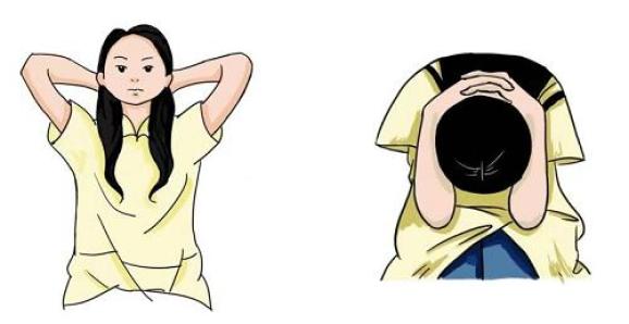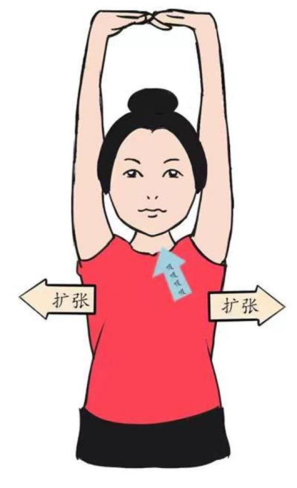 双手抱头,吸气时抬头挺胸,双手向外打开,吐气时,低头缩胸,双手收拢。