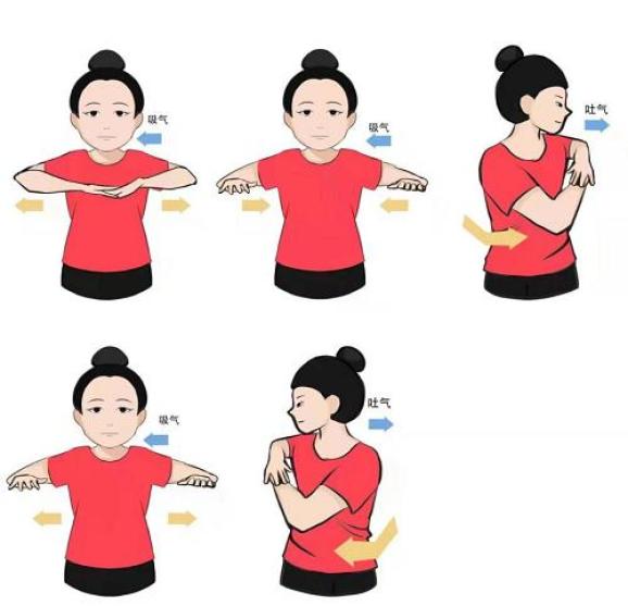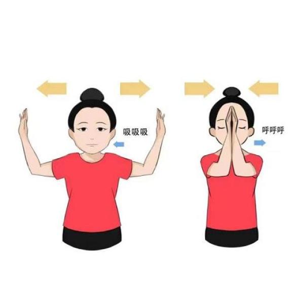 双手外展90度,用鼻缓慢深吸气,同时双手向两侧最大范围的张开,经口吐气时,双手肘互相靠拢,在胸前相贴近。