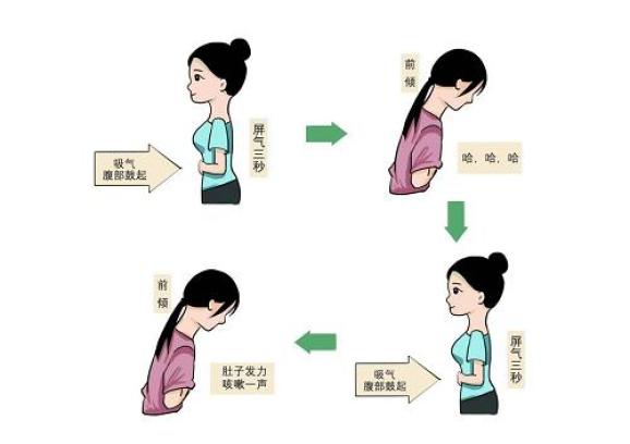 用鼻缓慢深吸气,吸气后,屏气保持3秒,身体前倾,张大嘴,快而短促的连哈3次气。再次用鼻缓慢深吸气后屏气保持3秒,调动胸、腹肌力量,完成1次响亮有力的咳嗽。避免用嗓子发音出现清嗓子的行为,这不是正确的咳嗽方式。