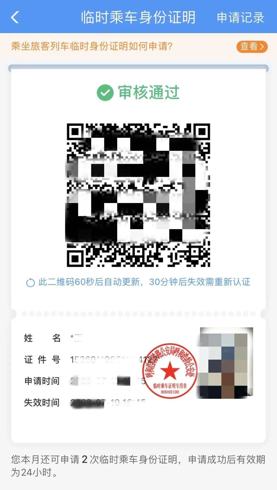 电子临时乘车身份证明每人在一个自然月可申请3次。如果申请超过3次,请前往车站的公安制证窗口办理纸质临时乘车身份证明。