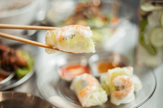 越南粉卷,薄如纸的肠粉大方加入猪肉或其他食材卷起来,配上越南特有的精肉团、芽菜和鱼露大口咬下,Q滑香甜让人不爱上也难。