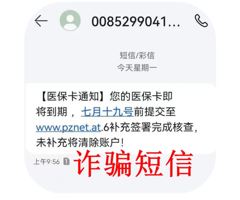例1:收到短信(0085开头)提示参保人“【医保卡通知】您的医保卡即将到期,×月×号前提交至××××网址补充签署完成核查,未补充将清除账户!”