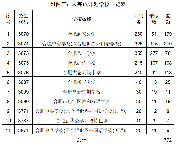 2022年合肥市区普通高中缺额补录计划共有772个,涉及8个高中学校及外语特色班。考虑到今年补录计划较多,为了满足更多考生就读普通高中的需求,将在补录阶段降20分征集志愿。即中考成绩567分及以上,且未被普通高中录取的考生,可填报市区普通高中补录志愿(567分及以上考生只是具备了填报普通高中补录志愿的资格,并不代表一定能被普通高中录取。请考生及家长在填报志愿时找准位置,合理填报补录志愿)。