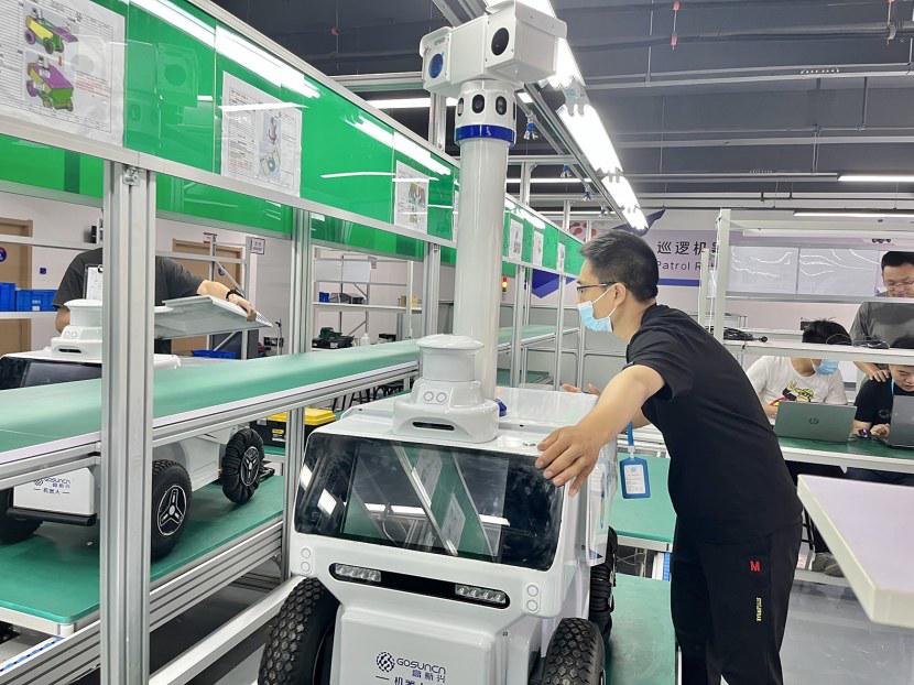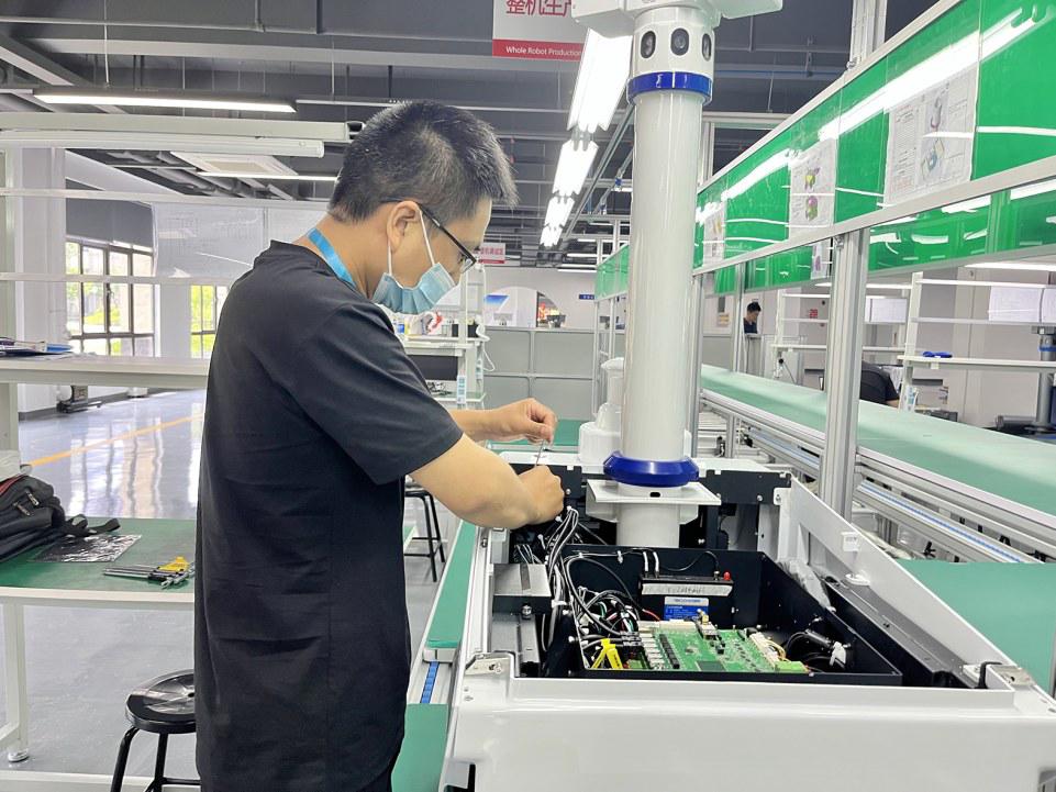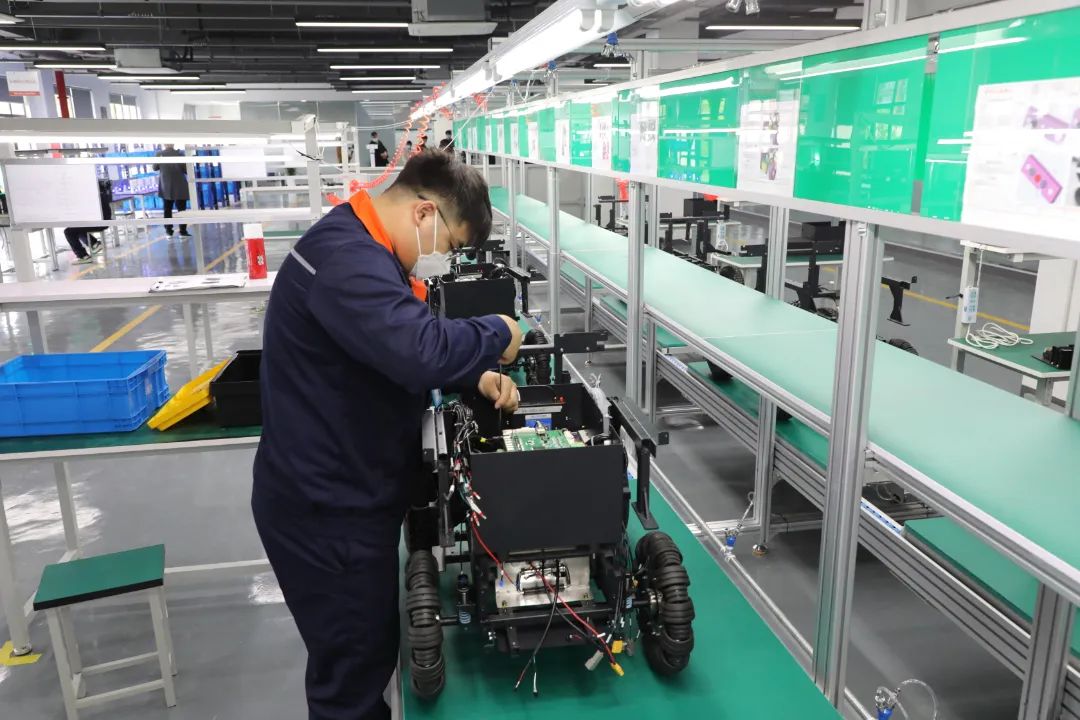 只见车间内一片生机勃勃:刚投入使用的新厂房里,系统配置、核心控制器组件、底盘外壳安装、整机组装、机器人调试……工人们正按照生产流程有条不紊地操作着各个生产环节,在最后一道工序现场,技术人员正在对机器人进行最后的可靠性测试,一台拥有“十八般武艺”的成品便打包入库,即将运往全国各地。