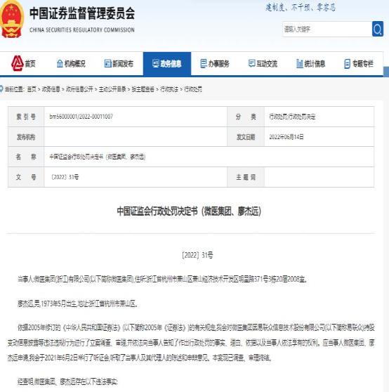 最终,证监会责令微医集团(浙江)有限公司改正,给予警告,对微医集团(浙江)有限公司合计处以3030万元罚款,对廖杰远合计处以8万元罚款。