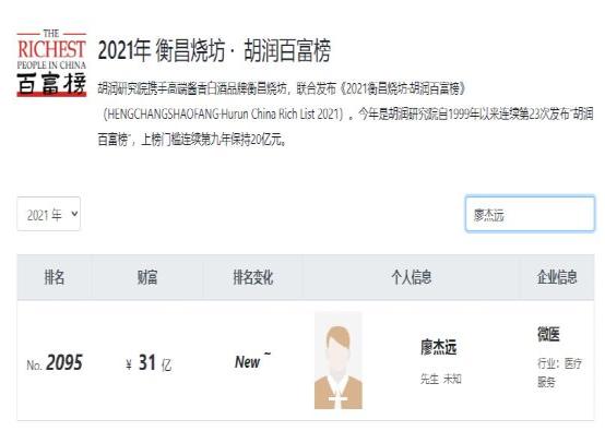 2015年9月,微医创始人、董事长廖杰远入选福布斯“2015中美创新人物”榜。2021年10月,廖杰远以31亿元财富值在《2021年胡润百富榜》中位列第2095名。