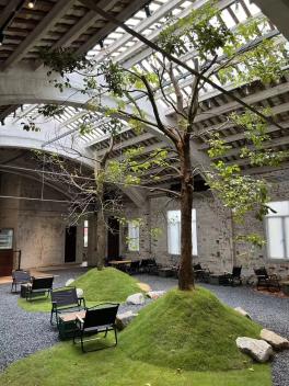 转角进门,豁然开朗,超大空间与老街区的小巷形成巨大反差,闯入眼帘的两棵葱郁大树,让你怀疑进门后到了另一个空间,树下翠绿的草坪与大树相互映衬,碎石子铺就的地面踩上去沙沙作响,这是把马拉松公园搬进了启明里,树下放置的户外折叠椅早已坐满了客人,让人情不自禁地找个空位坐下。